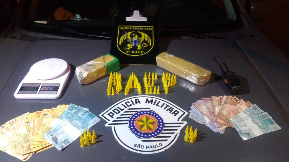 Segundo o BAEP o homem, que tem o apelido de “Ray”, fugiu ao avistar a viatura do batalhão, mas foi alcançado pouco tempo depois e com ele foi encontrado dois tijolos de maconha, aproximadamente 90 pinos de cocaína, quase R$3000 em dinheiro, uma balança de precisão e um rádio de comunicação.