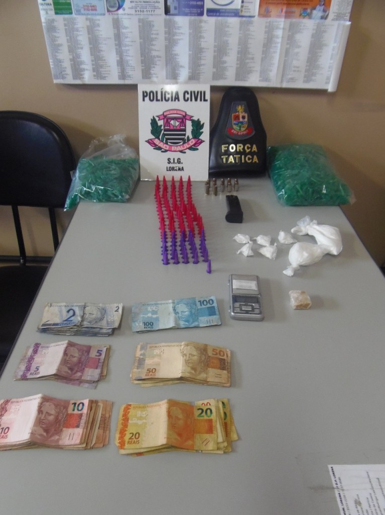 Segundo a PM foi cumprido um mandato de busca domiciliar pela Rua Antônio Malerba na Cecap. Nas buscas por apartamentos que estavam no nome do suspeito, foram encontrados dois sacos de ependorfs vazios, 116 ependorfs com cocaína, 134 gramas de cocaína a granel, uma pedra bruta de crack pesando 17 gramas, gilete para cortar a pedra de crack, balança digital, carregador de pistola .40, 12 munições intactas do mesmo calibre e R$ 1881,00 em notas diversas.