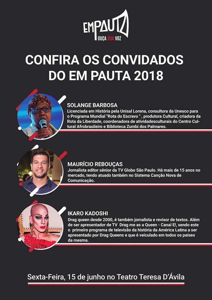 O Em Pauta 2018 – Representatividade das Minorias Na Mídia – acontece sexta-feira, 15 de junho, às 19 horas, no Teatro Teresa D’Ávila, na avenida Peixoto de Castro, 539 – Vila Celeste – Lorena.