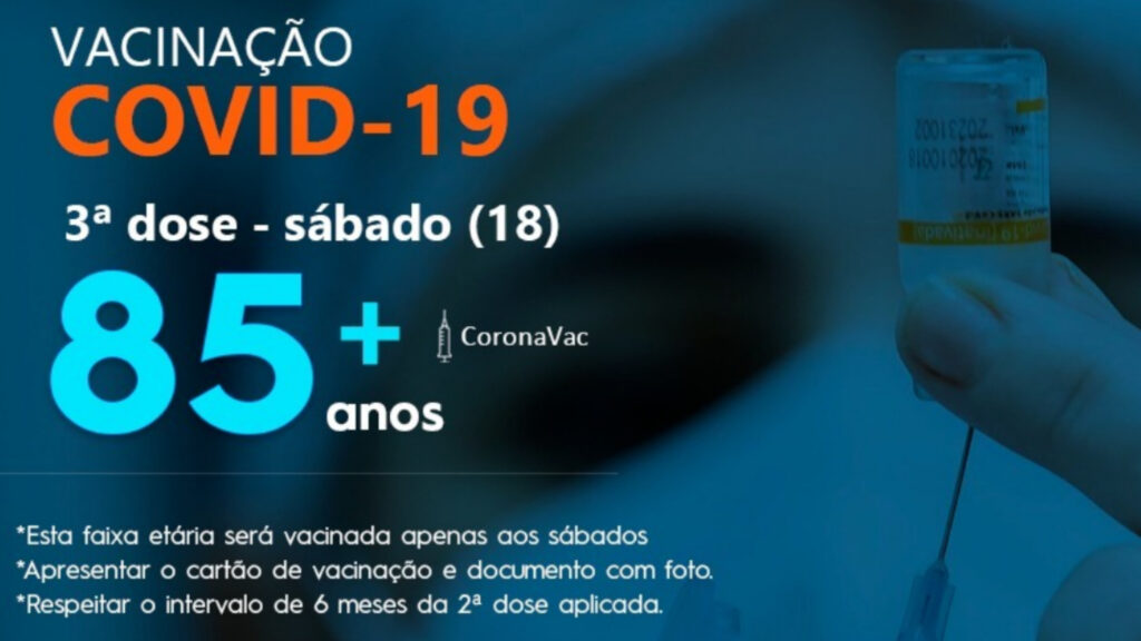 Neste sábado, 18 de setembro, Lorena segue com a aplicação da 3ª dose da vacina contra a Covid para idosos a partir de 85 anos. Segundo a Prefeitura, esta faixa etária será vacinada apenas aos sábados.