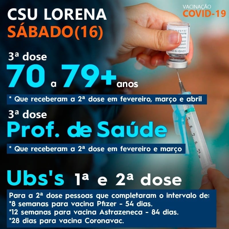 Neste sábado (16), vacinação no CSU (3a dose) e nas UBS’s (1a e 2a dose):