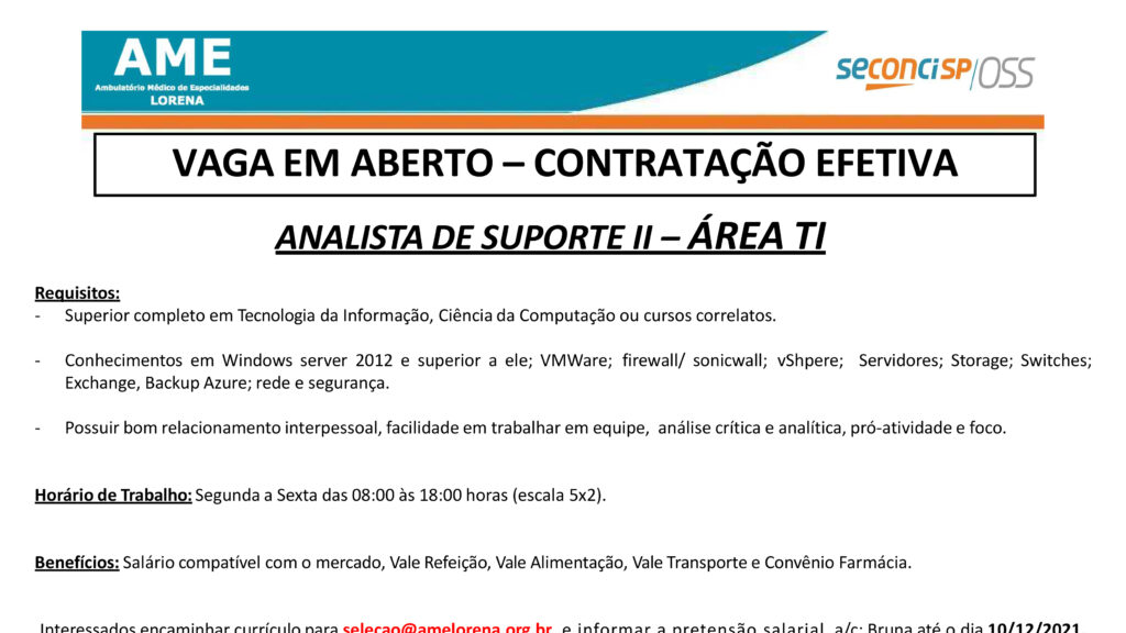 Compartilhar Facebook Twitter LinkedIn Pinterest E-mailO AME (Ambulatório Médico de Especialidades) divulgou, nesta semana, que está com duas vagas em aberto, para contratação efetiva: Gerente Administrativo e Analista de Suporte II – Área de T.I.. Confira os requisitos para cada vaga.