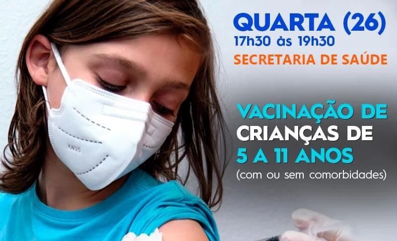 Segundo a Prefeitura, a vacinação das crianças de 5 a 11 anos contra a Covid-19 já contemplou crianças com comorbidades, deficiências, indígenas e quilombolas. Agora, começa a vacinação das crianças sem comorbidades: nesta quarta-feira, dia 26, exclusivamente na Secretaria de Saúde de Lorena, somente para esse público, das 17h30 às 19h30.