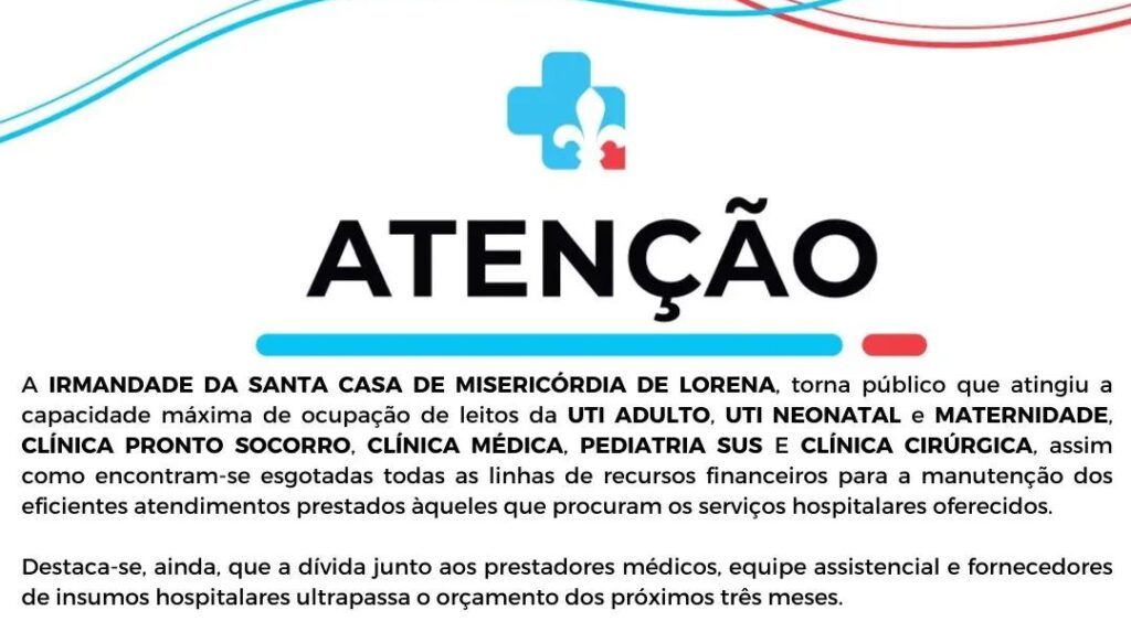 A Santa Casa de Lorena informou, em comunicado, que está suspenso o recebimento de pacientes para internações na UTI Adulto, UTI Neonatal, Maternidade, Clínica Pronto Socorro, Clínica Médica, Pediatria SUS e Clínica Cirúrgica.