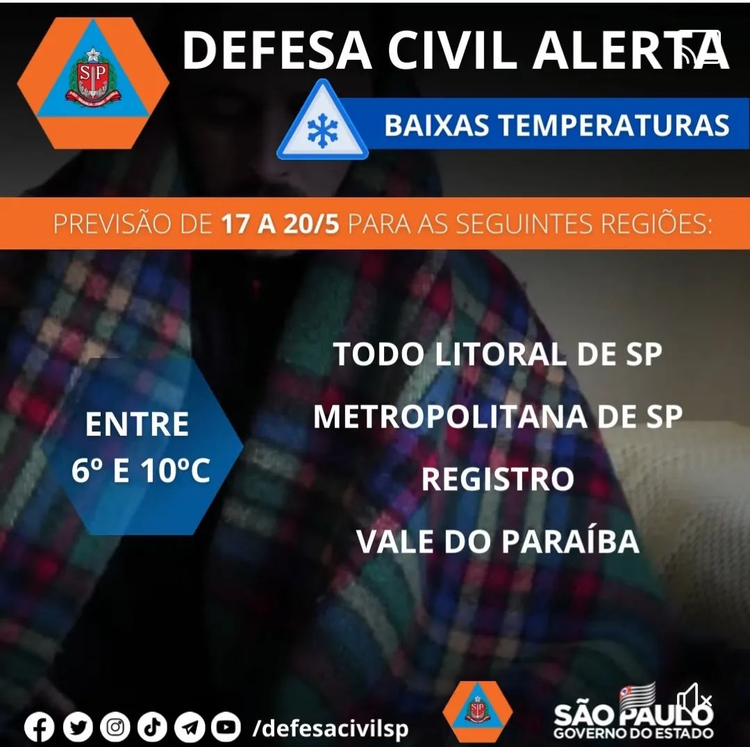 A Defesa Civil do Estado alerta que, entre terça-feira (17) e sexta-feira (20), uma intensa massa de ar polar avançará em todo o território paulista, provocando queda acentuada de temperatura, havendo momentos de frio intenso.
