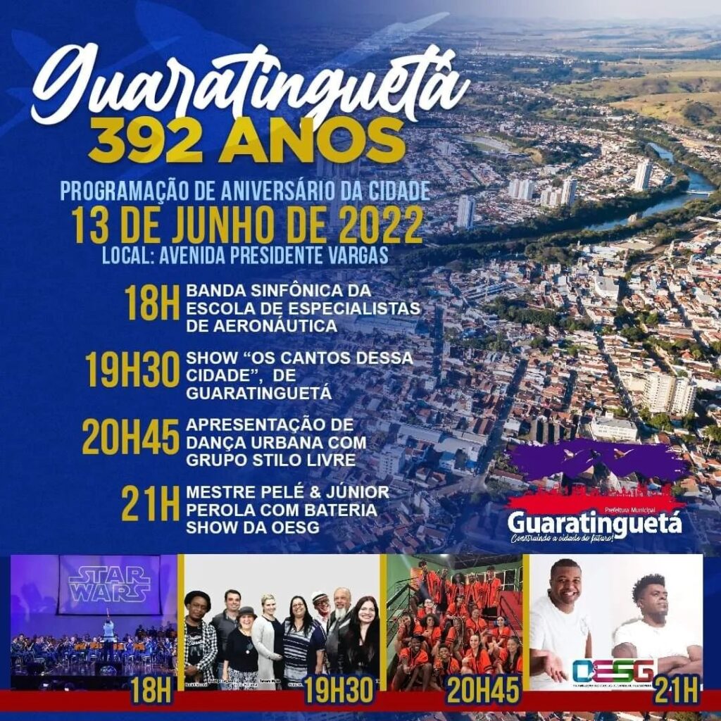 Na próxima segunda-feira, 13 de junho, nossa vizinha Guaratinguetá completa 392 anos. Será feriado na cidade e haverá programação festiva, preparada pelas Secretarias de Cultura, Turismo e Esportes.