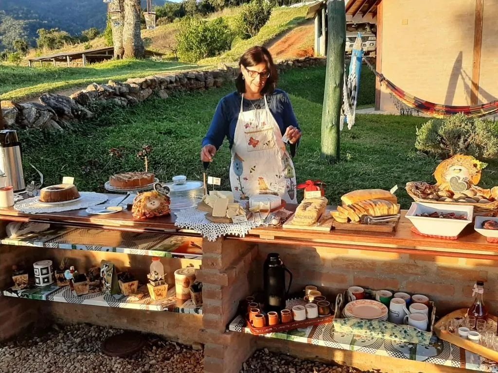 A partir das 16h30, é servido o Café Colonial, com mais de 30 itens, preparados com muito carinho e capricho. Ao entardecer, contemplando o pôr-do-sol, tem brincadeiras, sorteio de brindes e acende-se a fogueira, pra curtir o friozinho da montanha assando marshemellows.