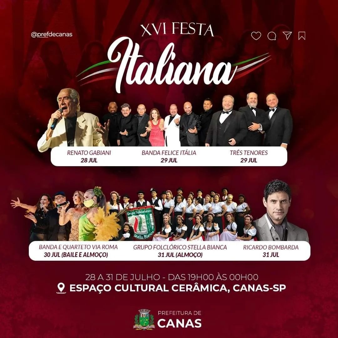 Compartilhar Facebook Twitter LinkedIn Pinterest E-mailA XVI Festa Italiana de Canas acontece de 28 a 31 de julho, no Espaço Cultural Cerâmica.Os shows terão inicio às 20h. Almoço sábado e domingo, a partir do meio-dia.Realização Prefeitura de Canas.