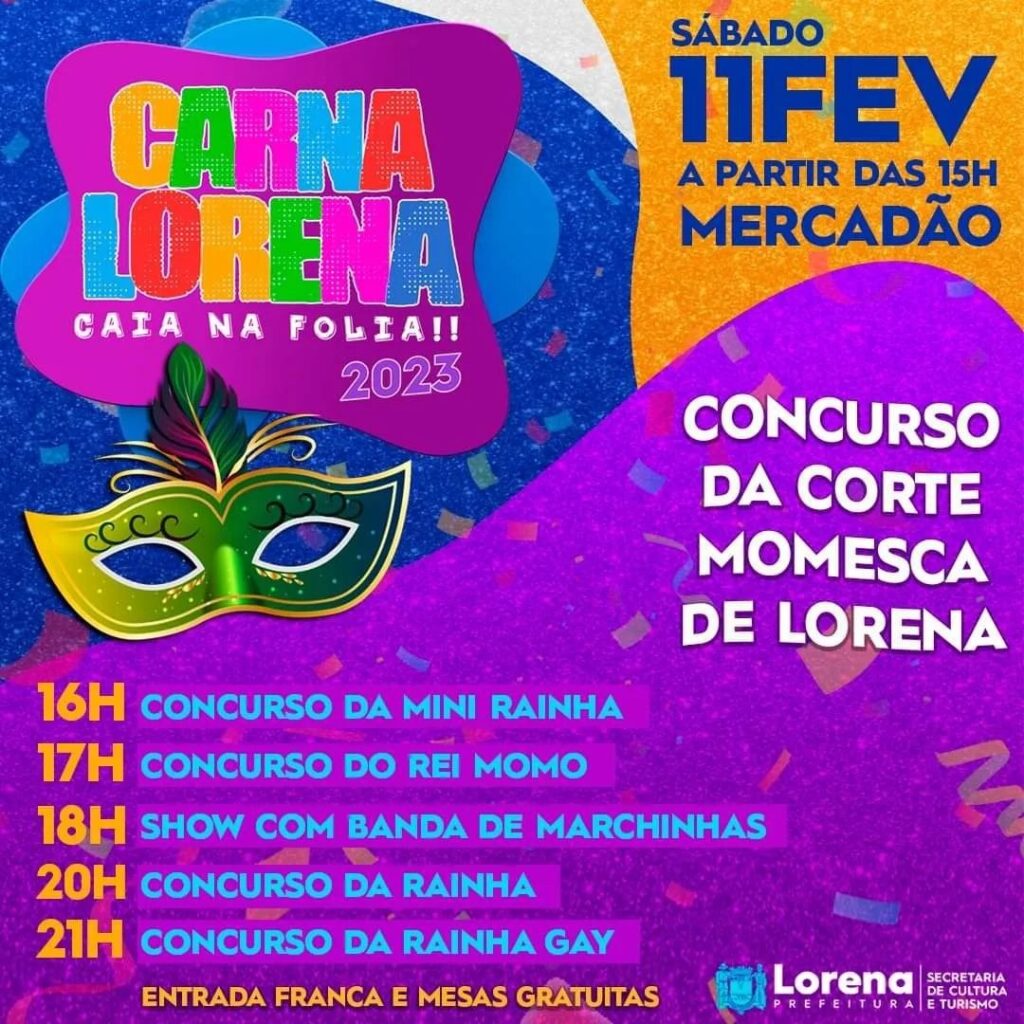 Dia 11 de fevereiro, a partir das 15h, no Mercado Municipal de Lorena, acontece o Concurso da Corte Momesca do Carnaval 2023. Segundo a Prefeitura, o evento marca o início das festividades do Carnaval na cidade.