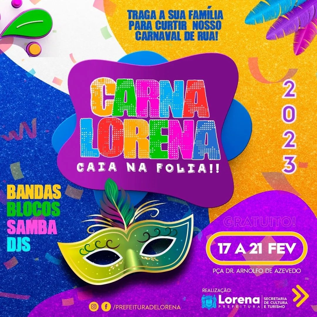 O Carnaval 2023 está chegando! Em Lorena, a programação acontece a partir dos dias 11 e 17 de fevereiro, no Mercado Municipal, seguida por mais 4 dias de festa na Praça Arnolfo Azevedo, dos dias 18 a 21, com matinês, shows, apresentações de blocos e escolas de samba.