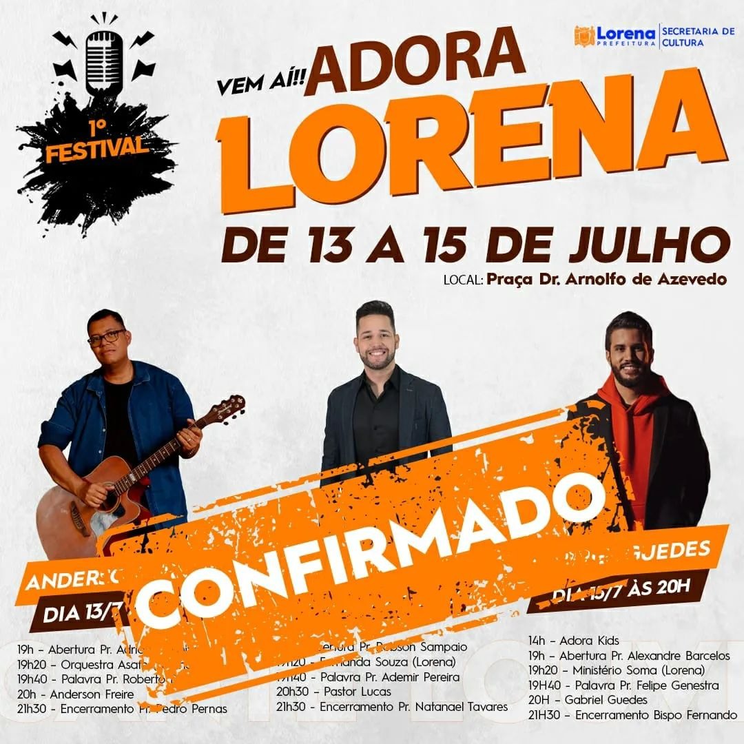 A Prefeitura de Lorena informa que está confirmada a realização do Adora Lorena, festival de música gospel, que irá reunir grandes nomes na Praça Dr. Arnolfo de Azevedo, entre 13 e 15 de julho.