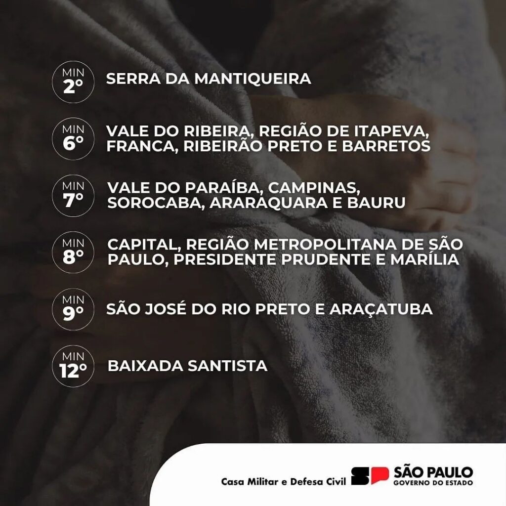 – Franca, Ribeirão Preto e Barretos: mínima 6°C, sensação térmica de 5°C