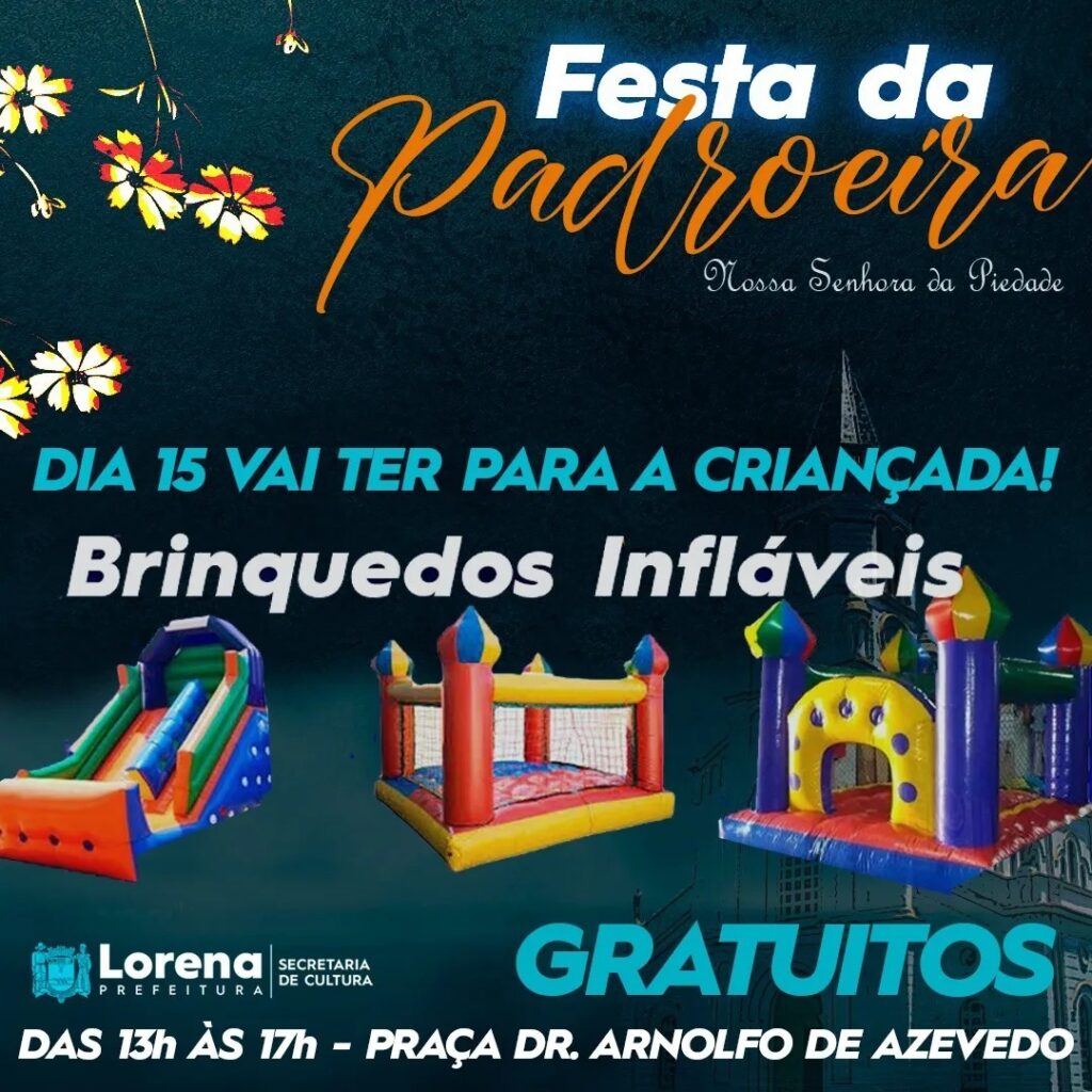 Amanhã, terça-feira, feriado de 15 de agosto, Dia da Padroeira de Lorena, a Prefeitura vai disponibilizar brinquedos infláveis gratuitamente na Praça Arnolfo Azevedo, das 13h às 17h. Toda a comunidade está convidada a prestigiar!