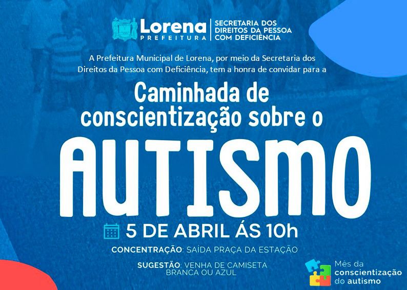 Neste sábado, 5 de abril, a Prefeitura de Lorena, por meio da Secretaria dos Direitos da Pessoa com Deficiência, vai realizar uma Caminhada de Conscientização sobre o Autismo. Será a partir das 10h, com concentração na Praça da Estação e trajeto até a Praça Arnolfo Azevedo.