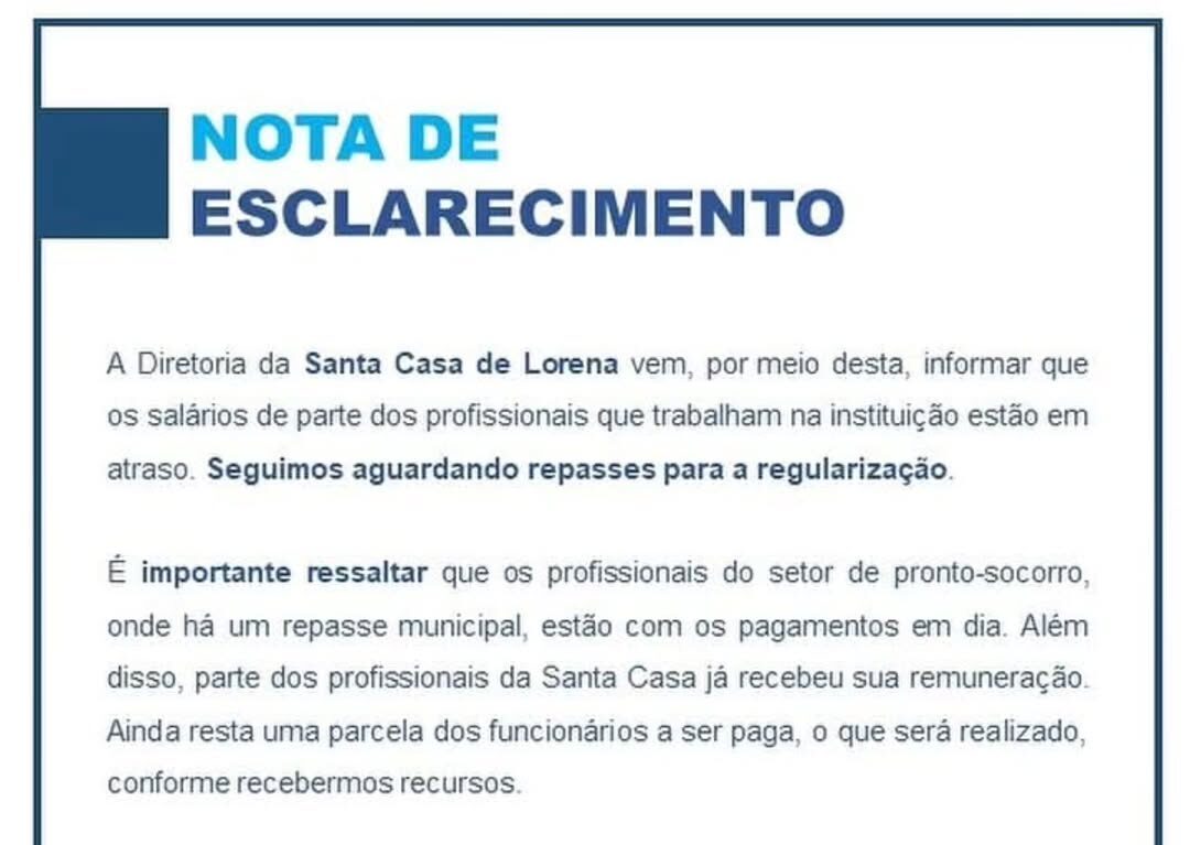 A Diretoria da @santacasadelorena vem, por meio desta, informar que os salários de parte dos profissionais que trabalham na instituição estão em atraso. Seguimos aguardando repasses para a regularização.