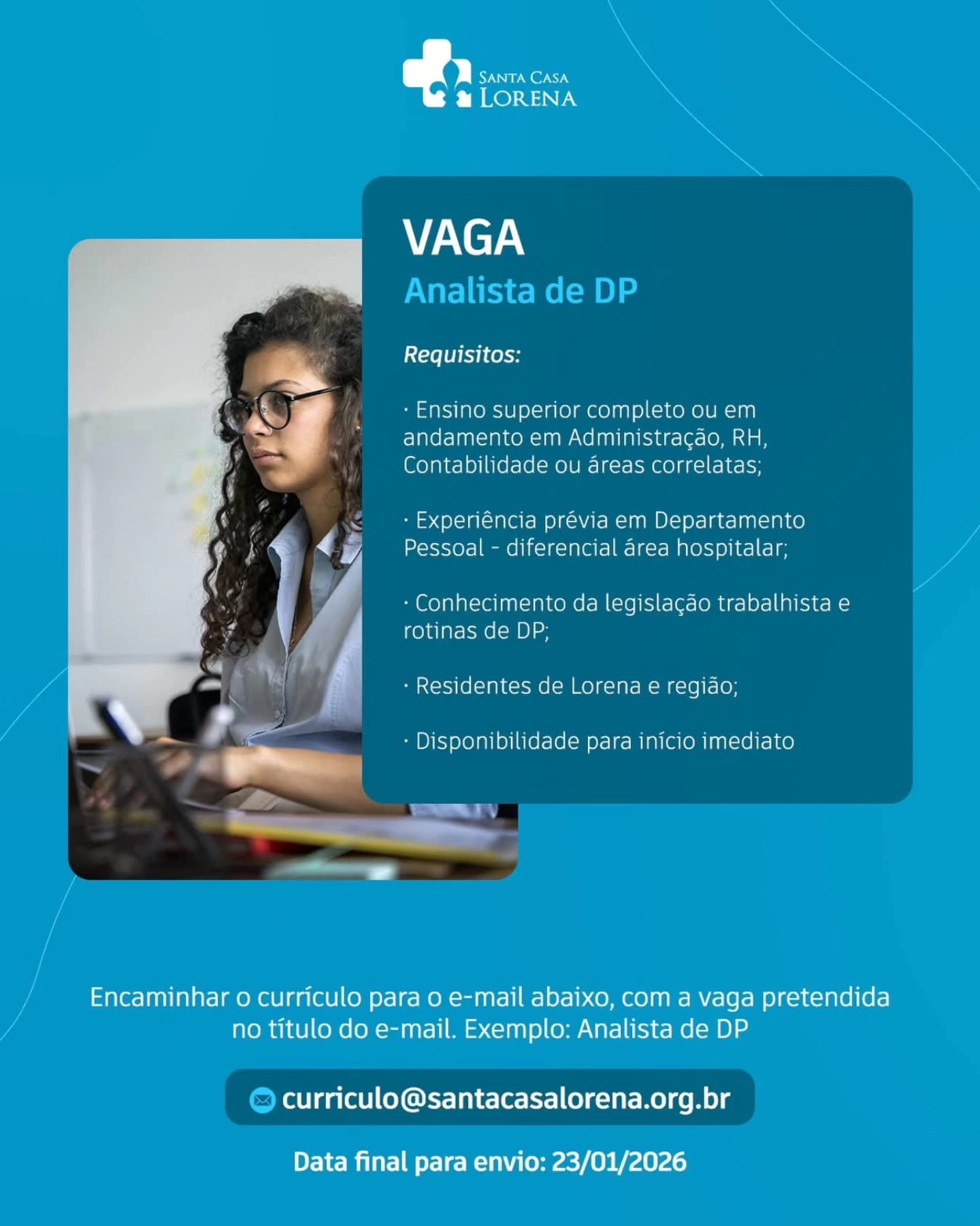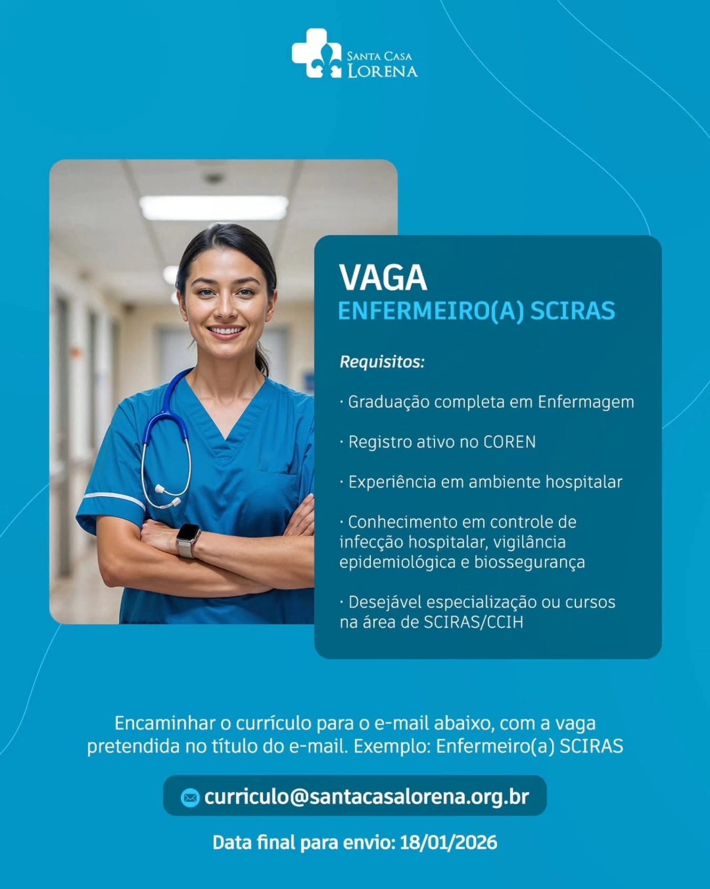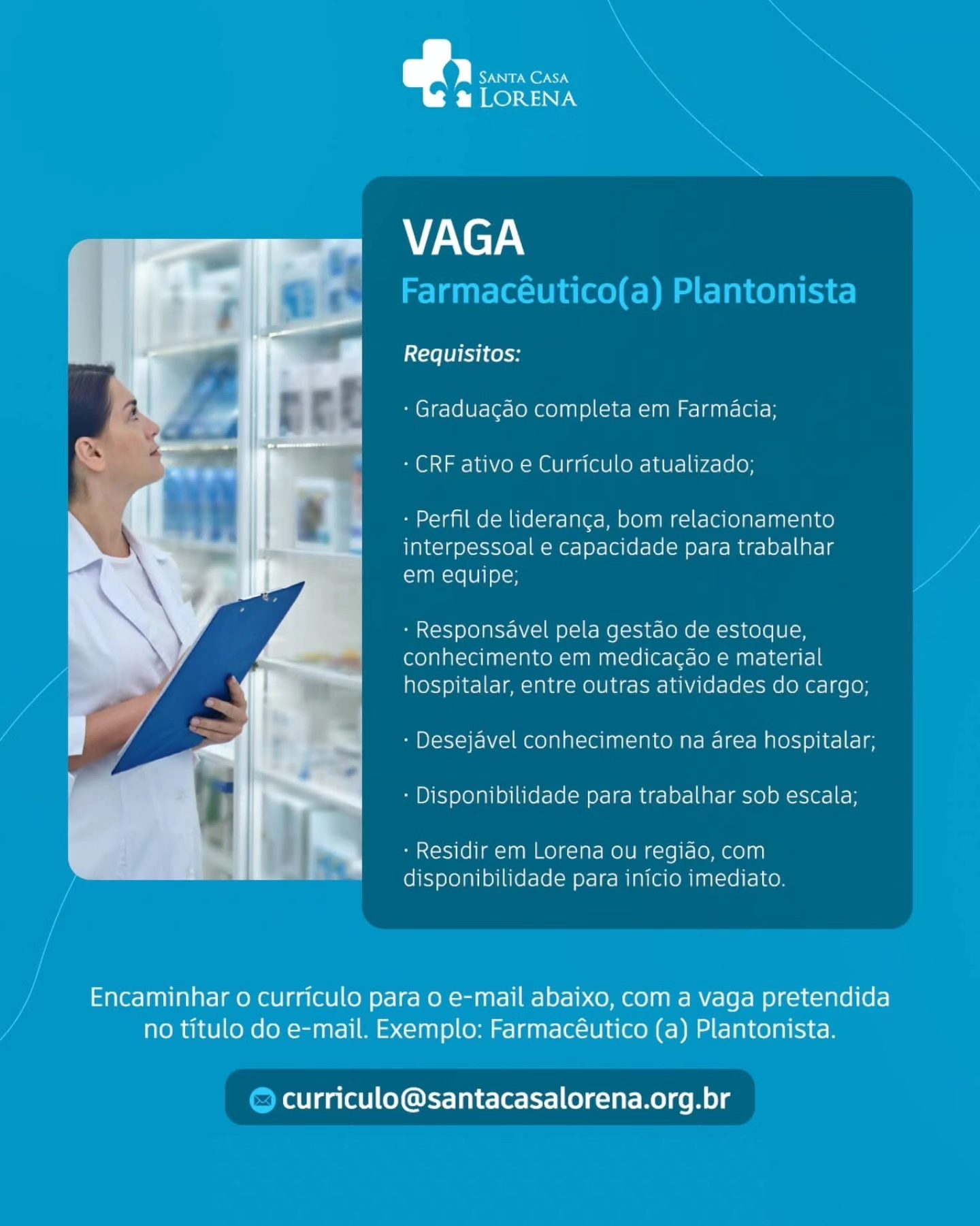 Compartilhar Facebook Twitter LinkedIn Pinterest E-mailVagas Abertas na Santa Casa de LorenaSe você se encaixa nos requisitos listados, envie seu currículo para:curriculo@santacasalorena.org.br