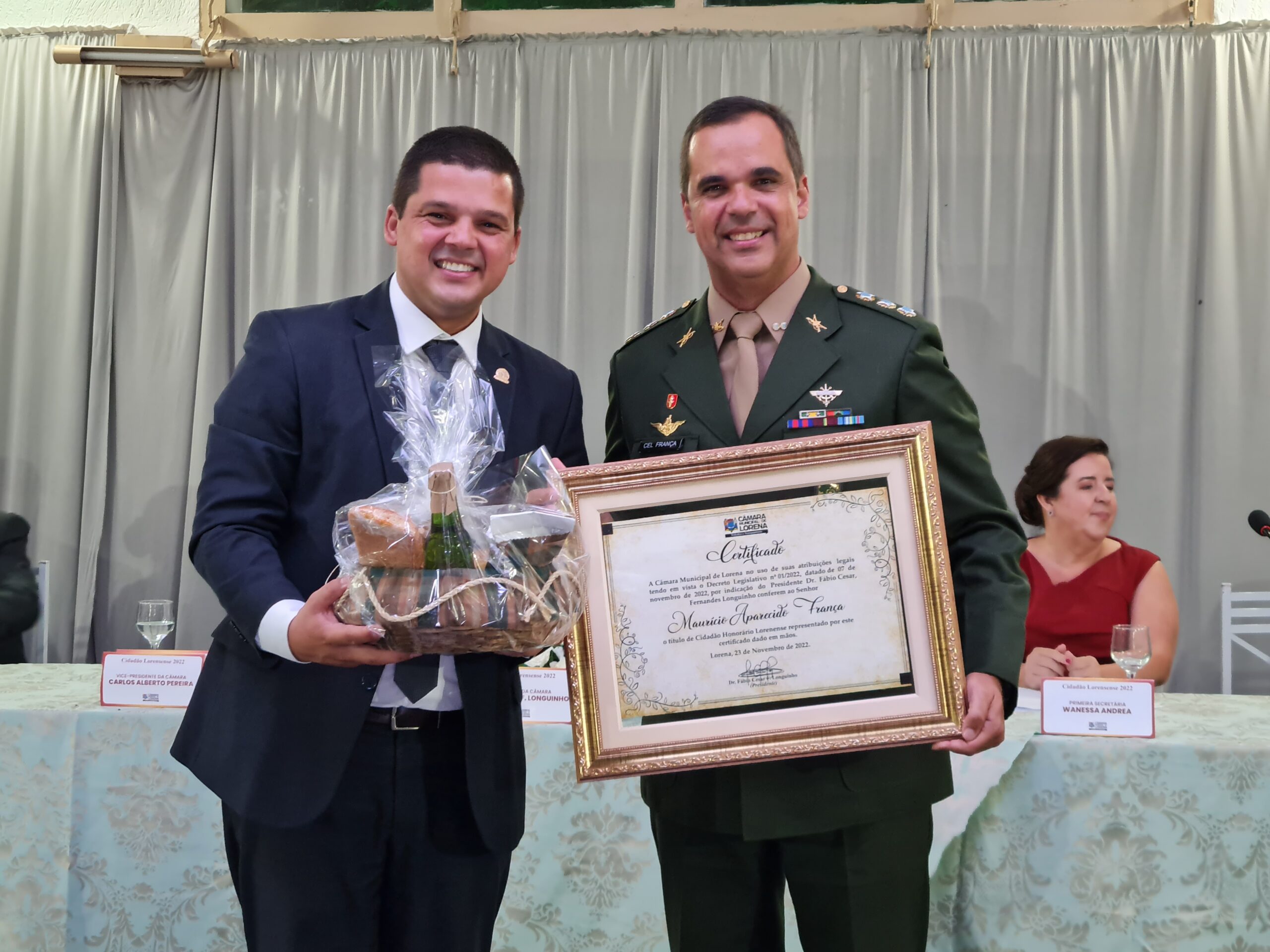 Homenageado pelo vereador Fábio Longuinho, presidente da Câmara, o Coronel Maurício Aparecido França é nascido em 20 de dezembro de 1977, na cidade de Brasília – DF, filho da Ivonides e do Ten Walter Ramos França. Casado com a Valquíria Soares França e pai da Giovanna, Giulia e Pedro Henrique.